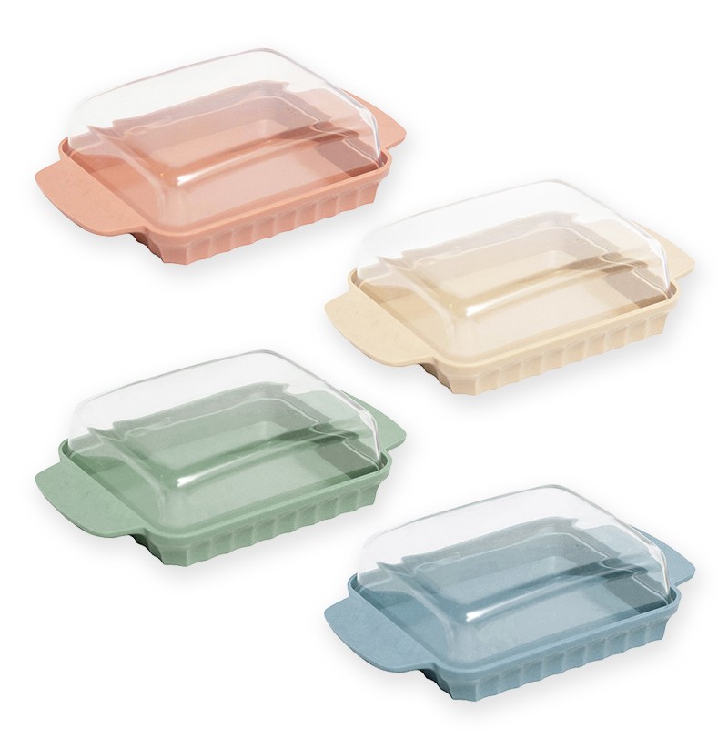 Mantequera con tapa transparente y base de color, fabricada con compuesto de madera lo que reduce el uso de plástico y lo hace más amigable con el planeta.