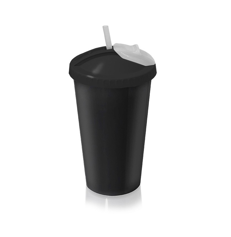 Vaso térmico con sorbete rebatible antiderrame. Ideal para bebidas frías. Libre de BPA. Capacidad 500 cc. Lavar a mano, no usar en microondas.
