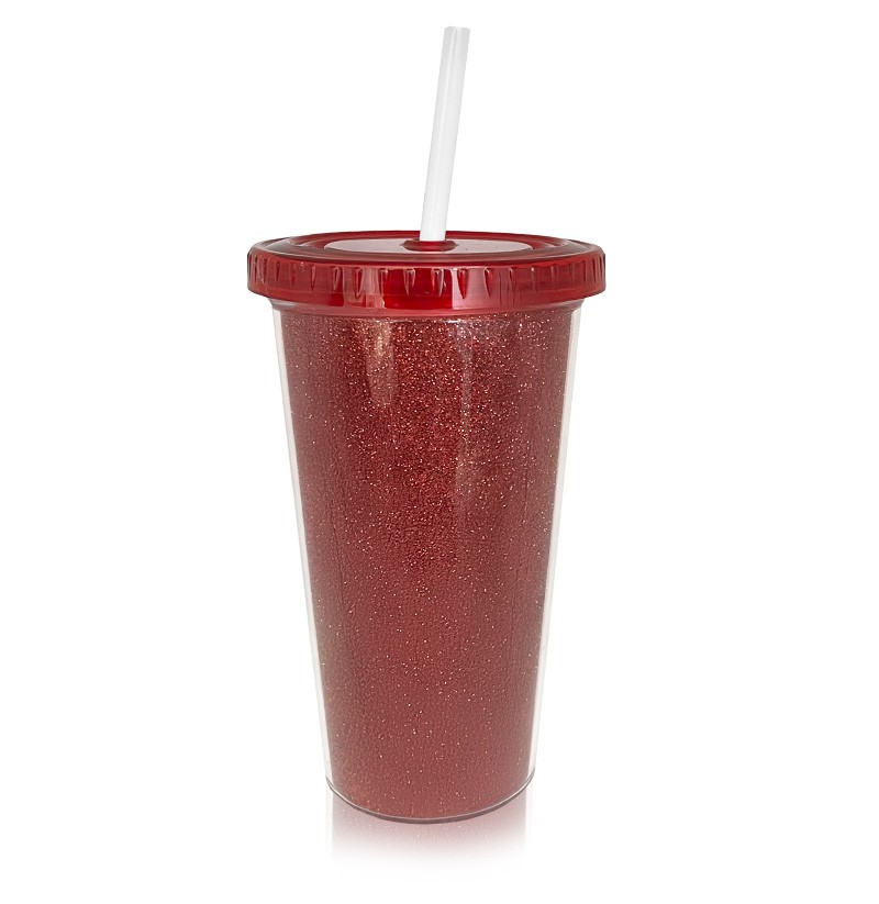 Vaso térmico con sorbete, ideal para bebidas frías. Libre de BPA. Cuerpo cristal con insert con glitter. Capacidad 500 cc. Lavar a mano, no usar en microondas.