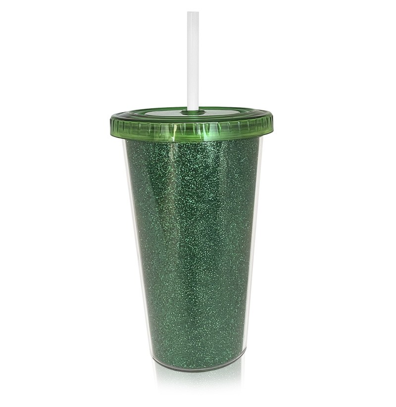 Vaso térmico con sorbete, ideal para bebidas frías. Libre de BPA. Cuerpo cristal con insert con glitter. Capacidad 500 cc. Lavar a mano, no usar en microondas.